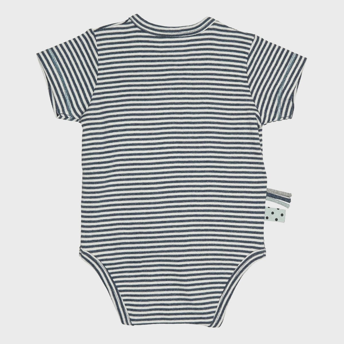 Realizzata in 100% cotone biologico certificato GOTS, questa tutina a maniche corte coccola la delicata pelle del bambino con eccezionale morbidezza e traspirabilità. L'intramontabile motivo a righe indaco dona al tuo piccolo ribelle del pannolino un tocco fresco e nautico.Perfetto per l'estate o come intimo alla moda!
